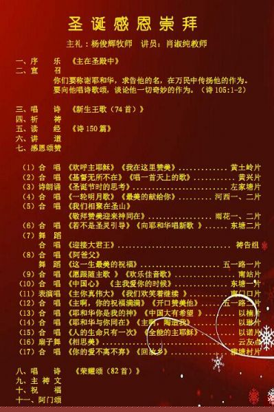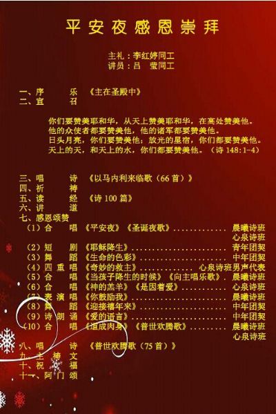 圣诞感恩崇拜:2015年12月25日(礼拜五)上午八点半一场。