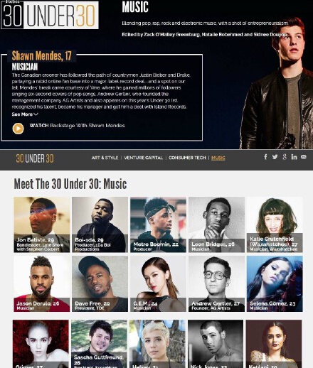 此前,邓紫棋就于2014年首次登上福布斯中国名人榜,后于2015年5月,再度进入2015年福布斯中国名人榜,综合排名由91位一跃成为第11位。此次“全球30岁以下最具潜力30人”榜单由《福布斯》编辑、记者与专家评委小组合作评选,在全球媒体范围内具有极高的权威性。据悉,扎克伯格、Lady Gaga、斯汀·比伯等艺人都曾进入《福布斯》“全球30岁以下最具潜力人士”的榜单。