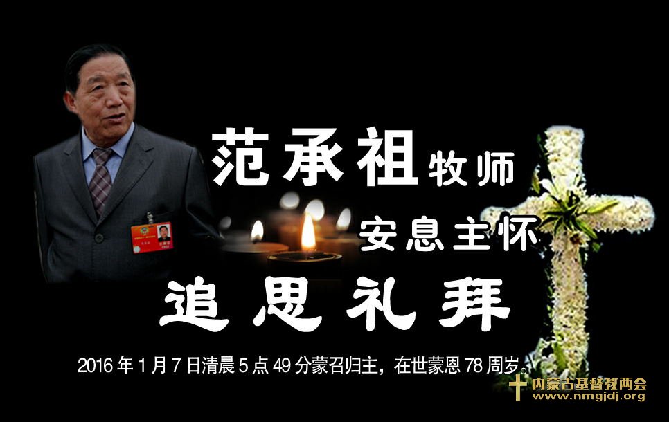 原内蒙古自治区基督教“两会”主席范承祖牧师于2016年1月7日清晨5点49分安息主怀,享年78岁。其遗体告别仪式将于2016年1月11日(周一)上午9时,在呼和浩特市殡仪馆举行。追思礼拜于1月13日(周三)上午9时在新城南街基督教堂举行。
