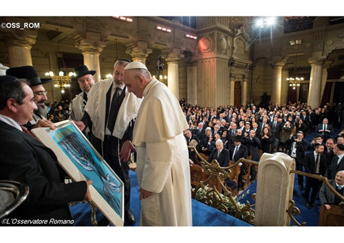 1月17日主日,教宗方济各访问了罗马犹太大会堂,直言“犹太人和基督徒是唯一天主大家庭中的弟兄姐妹,主视他们为他的子民并保护他们。”