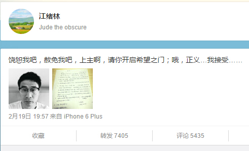 2016年2月19日晚,华东师范大学政治系青年学者江绪林自缢身亡,震动学界。自杀前,江绪林在微博上如此写到:“饶恕我吧,赦免我吧,上主啊,请你开启希望之门;哦,正义…我接受……”据说,江绪林的同事在确认江逝世之后在 朋友圈写到,“希望他信仰的主在天国给他温暖和爱。”