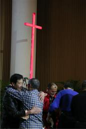 海淀堂把这12只盆子送给被洗脚的会众。会众与为自己洗脚的执事相拥满怀。