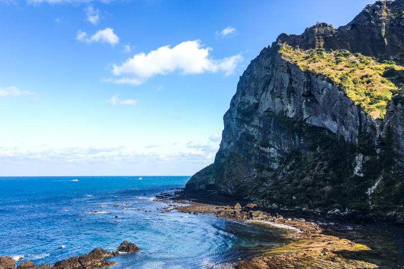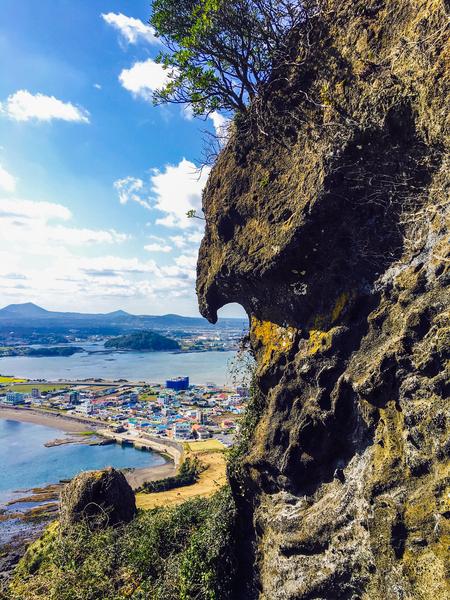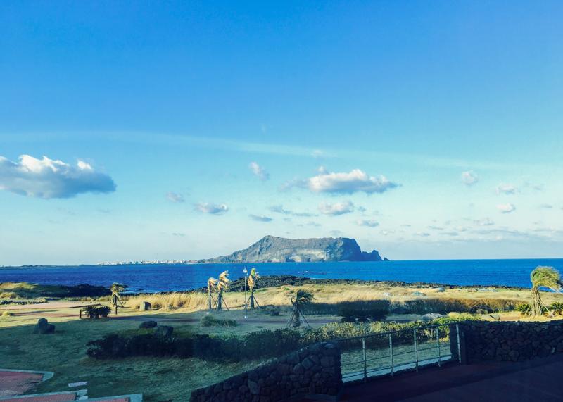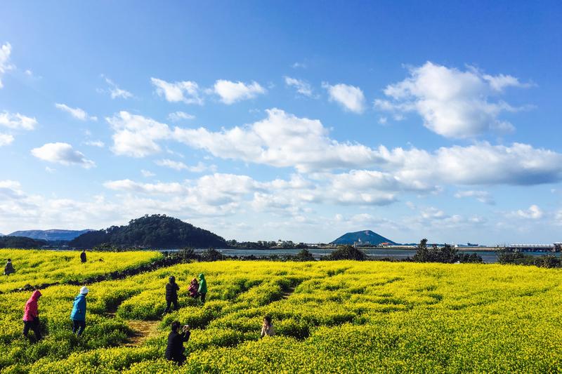 除了去水族馆,当天还去了城山日出峰,那是一个观看海上日出的最佳去处,位于济州岛的最东端。日出峰海拔182米,系10万年前海底火山爆发而形成,近可看山观海,远可俯瞰济州岛城,附近的油菜花一片金黄,风景美不胜收。