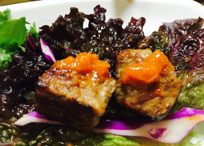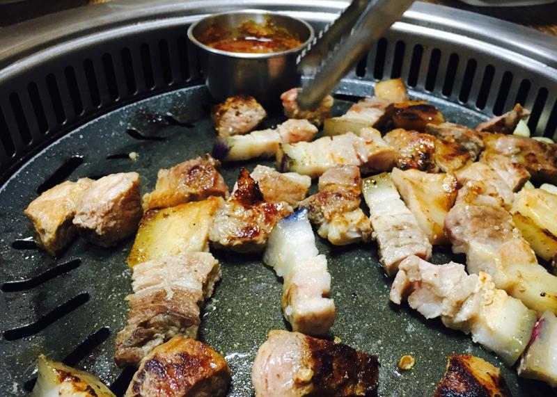 济州岛最有名的美食当属烤黑猪肉了,很多店面的招牌上都可以看见黑猪的头像。逛完水族馆和城山日出峰,导游带着我们去吃了非常美味的烤黑猪肉,包在芝麻叶、生菜里,蘸着辣椒酱一起吃,五花肉肥而不腻,吃完齿颊留香。
