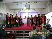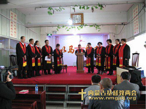 内蒙古基督教两会网站消息,10日上午9点整举行的按立圣职典礼中,“按立团”成员分别为三位同工施行按立礼。按立董征宇为教师,王子才、牛广平为长老,并由谢宝华牧师为新按立的同工佩戴圣带、赠送圣经。