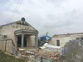 随后去后院看了看,发现教堂周围的铁护栏都被吹塌了,水泥块也被吹走几米远,有的地方的钢筋也被吹弯了,蓝色的彩钢瓦被从车棚顶上掀起,蜷曲在地上。