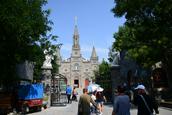 再走经过又看到天主教堂,被一座雄伟的建筑所吸引。大堂气势雄伟,规模宏大,圆石柱大门,东屋坡上有石头雕刻的花纹“十”字架,甚为壮观,圣堂两侧有两座钟楼,双塔高耸,气势宏大。教堂以灰色为主调,中间有三个红色大门,圣洁典雅。左右大门上有象征和平的鸽子,中间雕有耶稣像,左右雕刻着“荣主”、“益人”大字。可是不能进入天主教堂,看到他们庄严地敬拜。