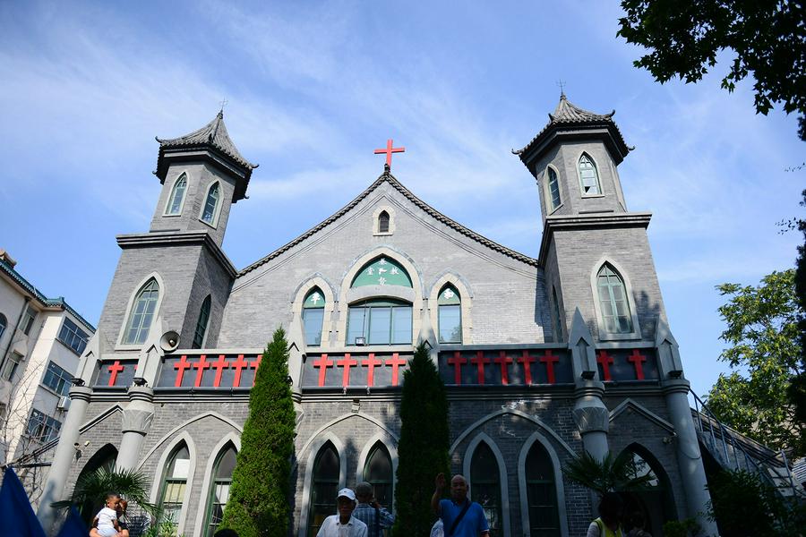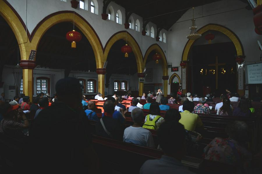 走到古街中看到基督教堂,院内建筑呈中西结合式,正中雄伟的大教堂坐西朝东,左右为对称式建筑,整个建筑群风格独特,布局精巧,幽雅别致,外部为中国古老的青砖小瓦,内部为欧洲哥特式建筑,精密的木结构,令人称绝。教堂周围树木遮日,幽静宜人,柔和的光线给人一种安静、祥和的感觉。26号主日教堂礼拜,我们进到教堂内时服侍人非常热情接待我们去坐安静默祷,再唱赞美歌,震撼了我们的心。