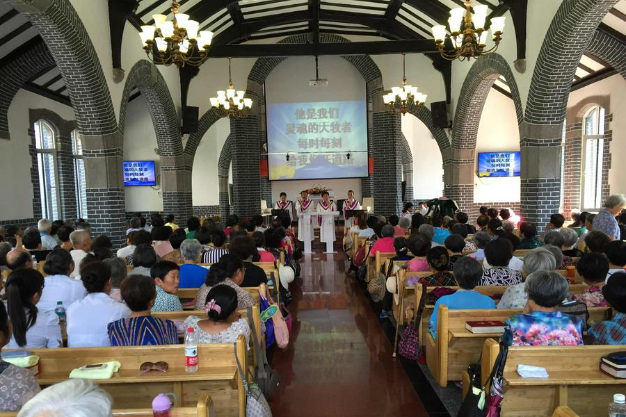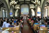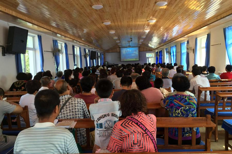按牧典礼在9点正式开始,在这之前是赞美敬拜的环节。接待的同工介绍,一些信徒早晨6点就到了。带领敬拜的4位同工与全体信徒一起唱了《人的生命只有一次》《你就是耶稣》《一生一世爱着你》《宣教的中国》等歌曲。辽阳教会主堂和二楼坐满了人。