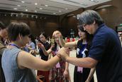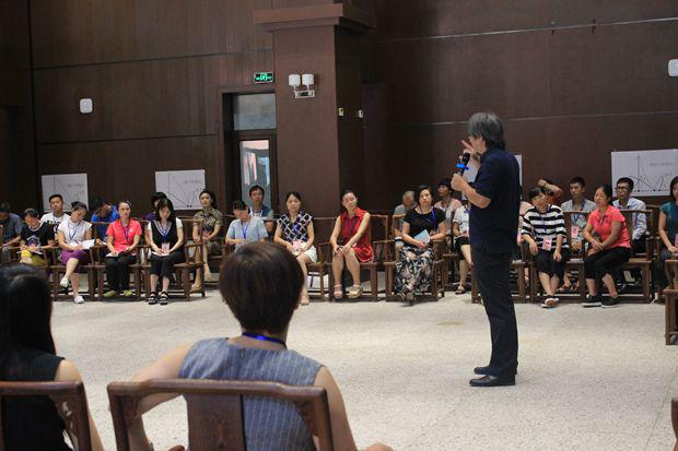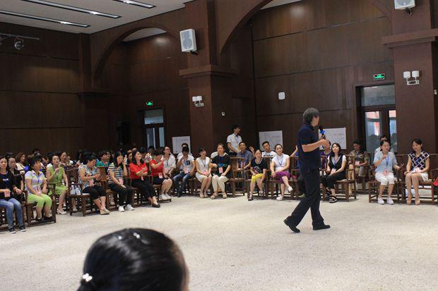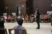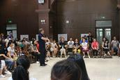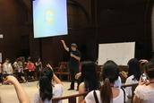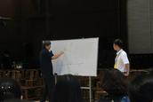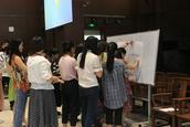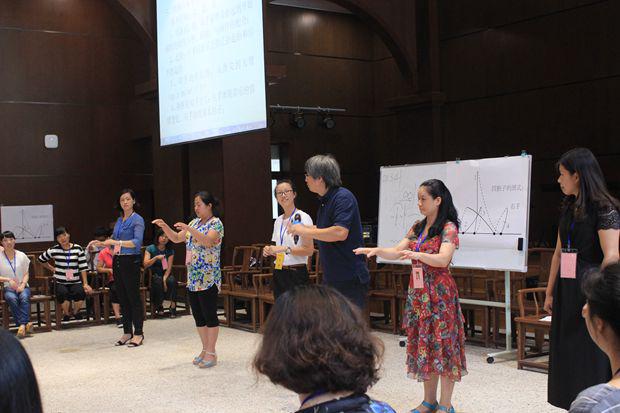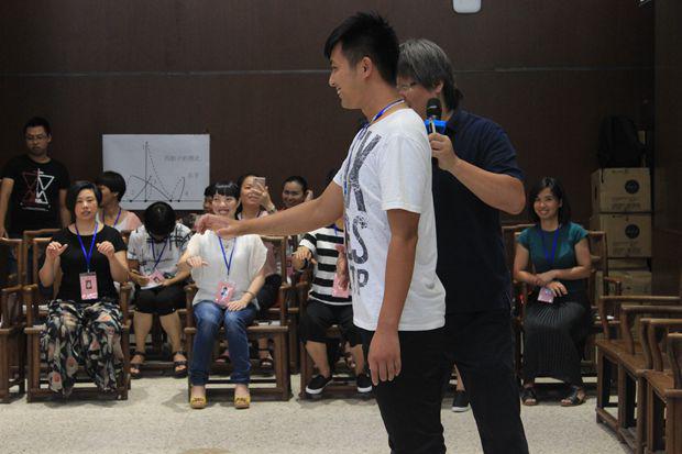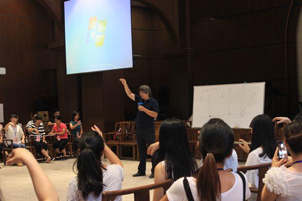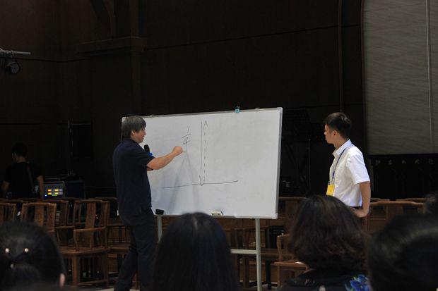 盛勇老师首先邀请大家观看了几段不同音乐风格的视频,教导大家正确的指挥姿势正,指导大家就一节拍、二节拍、三节拍、四节拍按照图示进行分组训练,并就指挥在乐团当中的作用进行介绍,指挥如何运用手势的轻柔幅度指导整个乐团,如何根据钢琴、架子鼓等不同乐器进行指挥等。期间,他邀请学员上台进行实地操作,纠正姿势,练习如何将自己的想法通过手势的高低起伏、强度等传递给整个乐团。下午,他邀请大家按照女高音、男高音、女低音、男低音分场地而坐,配搭进行演练。整个上课风格活泼,学员纷纷表示受益匪浅。