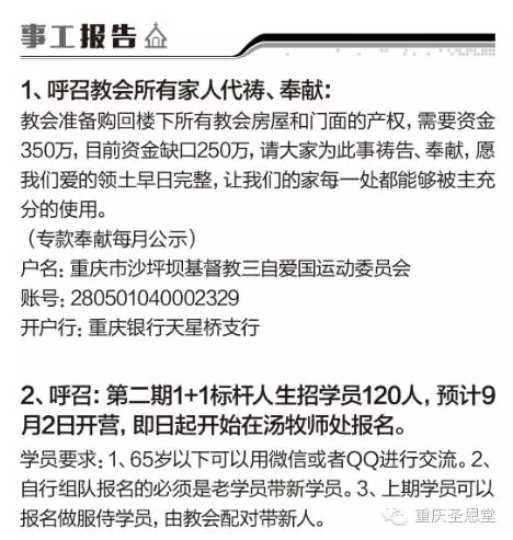 重庆圣恩堂8月13日通过教会微信公众号发布事工报告,圣恩堂准备回购该堂楼下所有教会房屋和门面的产权,价值350万元,并向该教会信众发出代祷与奉献呼吁。