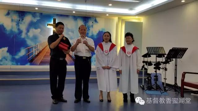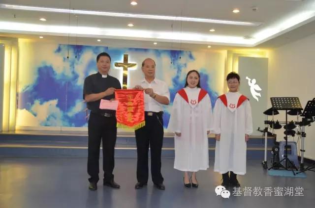 最后,香蜜湖堂与汕头乐义诗班互赠礼物,邱牧师祝福,会后合影留念。