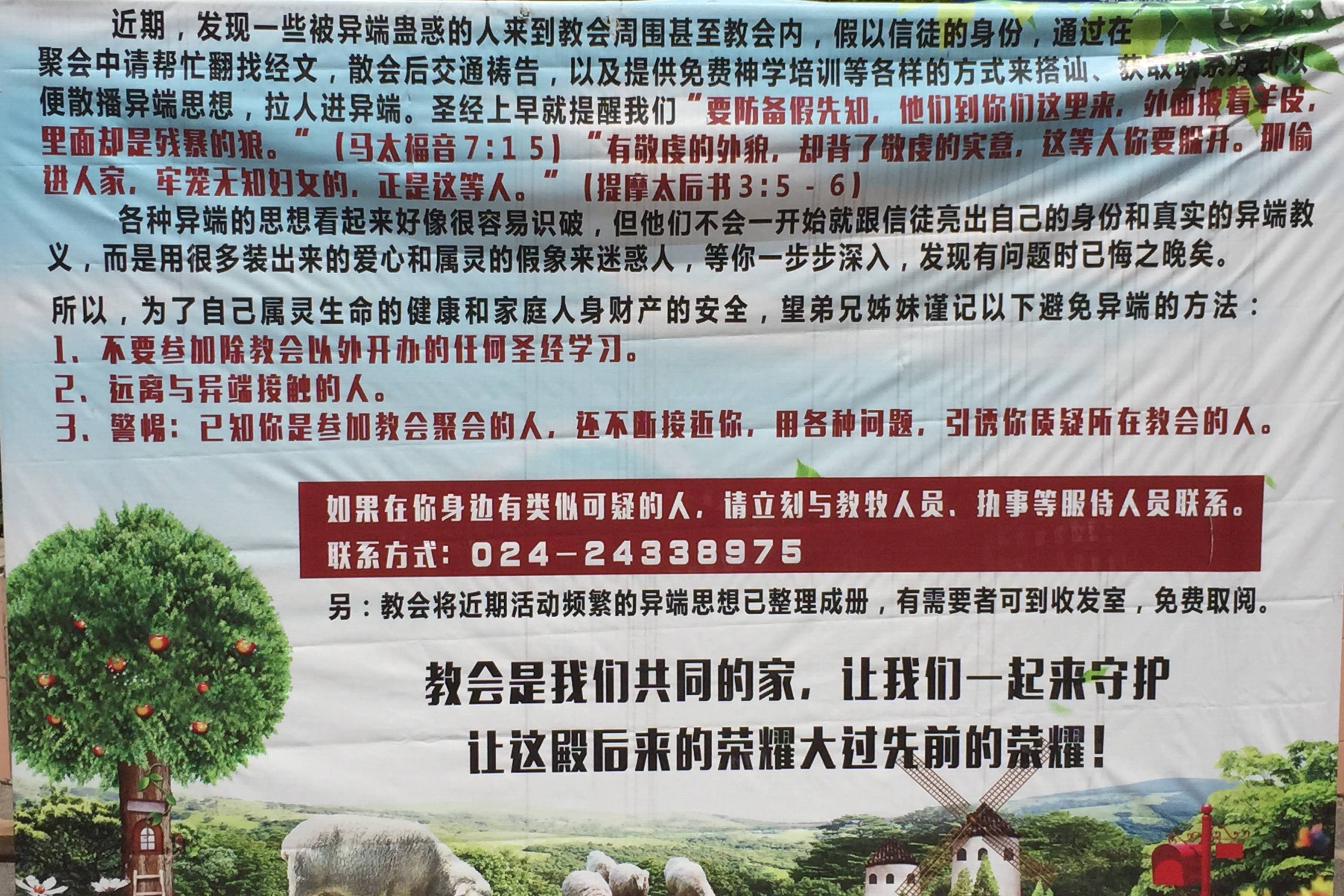 沈阳东关教会近期在教会院内以海报的形式提醒信徒提防异端,海报中介绍了异端拉人的形式,给信徒提供了3条远离异端的方法。