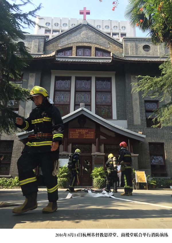 杭州基督教会思澄堂网站报道了演练情形。首先,上城区消防大队鼓楼中队7名消防官兵在思澄堂大门口展开演练。接到“火警”后,鼓楼消防中队消防车迅速赶到,消防官兵立即铺开水袋,连接“三通”,手持消防龙头,扑向三处着火点,及时扑灭“火灾”。接着,大家移师思澄堂小礼堂,警官结合案例作消防培训讲座,普及消防知识。