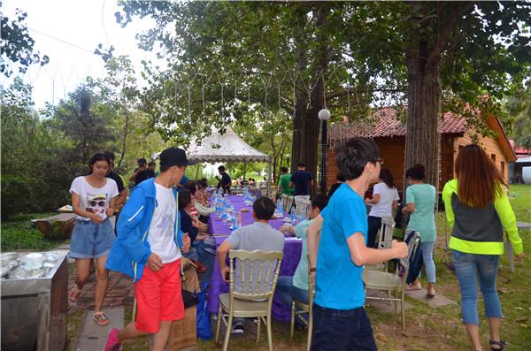 大家有的弹吉他唱赞美,有的弟兄搞笑地跳起了孔雀舞、有人背着媳妇跑、还有圣经知识问答、撕名牌游戏,还一同分享自己做的烤全羊等食物。