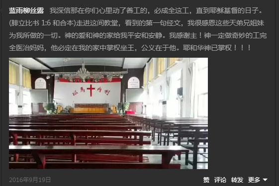 我的心渴慕神,渴慕弟兄姐妹可以和我一起祷告,给我力量和信心,让我持守神的约定不偏离左右。于是我特别想要找到教会,特别想要可以回到神的家,回到我天上爸爸的家。感谢主,神是眷顾我的需要的。2016年9月17日下午,我在去给爸妈收拾屋子的时候,走进他们的工厂。就是他们员工住宿的走廊墙壁上我看到了一张福音海报“神就是爱,耶稣爱你。 神的工人张弟兄,电话XXXXXXX”我兴奋、激动地拨通了那个电话,而且没有一点怀疑。仿佛这就是神给我指引,不,这真是神的指引。电话通了,电话那头的张弟兄似乎也没有任何的怀疑,听到我的自称是贵阳那边的一个姊妹,现在需要一个聚会点,想要为车祸中的父母祷告,需要弟兄姐妹们的持守祷告。张弟兄很有爱心地说:“姊妹,感谢主!明天正好是主日,你来我们教会吧。然后告诉了我教会的位置和聚会的时间。”