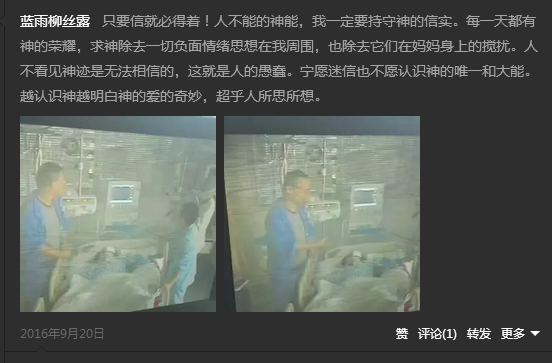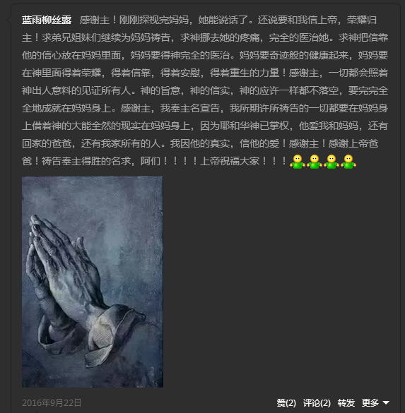 (这是2016年9月22日下午探视妈妈的时候,妈妈可以说话了。我因着感动发的朋友圈消息)