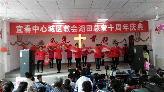 2016年10月15日上午,来自宜春各镇、乡、村教会的牧者、长老、执事,信徒和慕道者共计600多人,欢聚于宜春市袁州区湖田乡乌鸦村福音堂,共同庆祝湖田总堂建堂十周年。