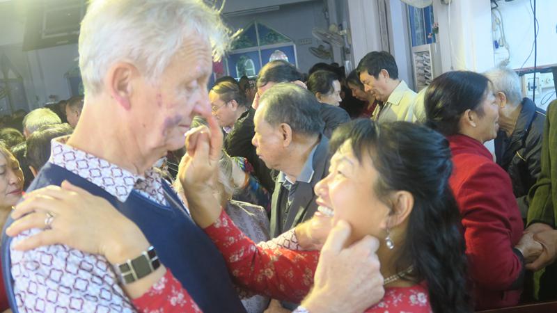 分享结束,吴鹏和贺军传道带领会众做“牵手一世情”的游戏。张业忠牧师带领大家做宣布婚姻誓言,并提笔送书法字画。贺军传道表示,当晚参加活动的很多弟兄姊妹十分感动,有的甚至当场落泪。