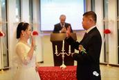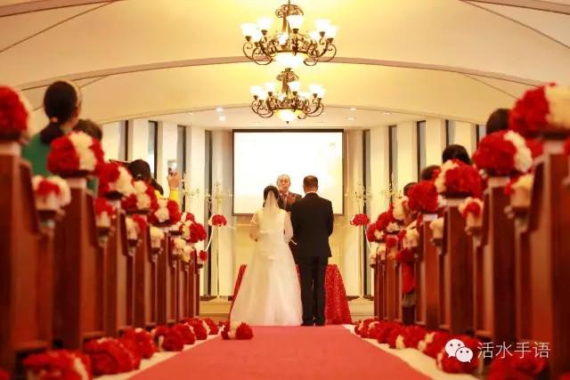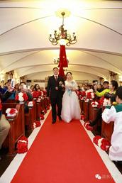 前去参加且有幸目睹一场基督教徒的婚礼,感受到和平时中国传统婚礼不一样的基督教会婚礼氛围,让人感到既新鲜又好奇,更庄重、肃穆,平添了许多感悟。来到烟台山百年联合教堂内,即刻感觉到一种神圣庄重。姚弟兄及宋姐妹的婚礼也按照基督教的程序有序的进行。步入教堂,一下子变得更为严肃起来。伴娘捧戒指入场,新郎和新娘再入场,新娘挽着新郎的胳膊同步走上了红地毯。牧者庄重地宣布婚礼开始。宣召、祷告、宣读经文、点燃蜡烛、询问、宣誓、交换信物、祝福祷告,圣诗班献诗《让我说声谢谢》,教会赠送礼品(圣经),礼成后,新郎新娘走出圣殿。整个婚礼过程简洁而庄重,直到中午当我们在莱山区酒店享用婚宴美餐的时候,婚礼曼妙的回忆仿佛还徘徊在脑海里。