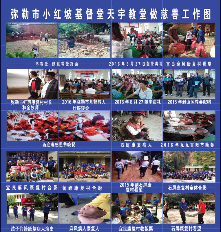 小红坡教会何长老介绍,自2014年上半年起,该教会同工就曾赴石屏县麻风病康复村探访,看到那里有的麻风病康复者能生活自理有的不行,而能自理的就帮助不能自理的人做饭,他们早已康复,只是在肢体上留下了残缺。那里常年有三位修女在侍奉。有的修女说,现在,那里的麻风病康复者享受着国家每月200多元的低保,但在生活上还是很艰难,有的人竟舍不得用钱,将低保存起来。