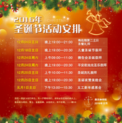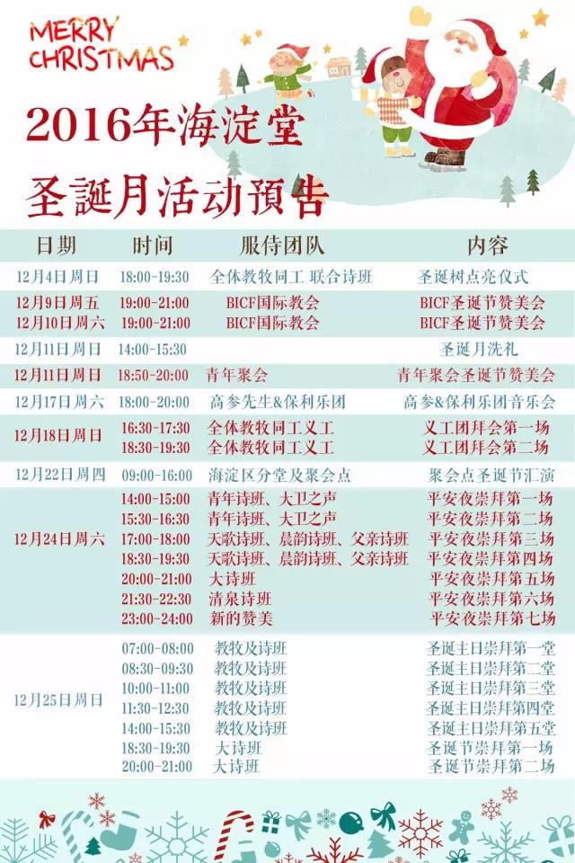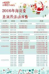 海淀堂点亮圣诞树仪式设在12月4日下午6点,教会其他圣诞月活动还有12月9-10日晚上的BICF圣诞节赞美会,11日的圣诞月洗礼与青年聚会圣诞节赞美会,17日的高参&保利乐团音乐会,18日的义工团拜会,以及22日的海淀区分堂及聚会点圣诞节汇演。
