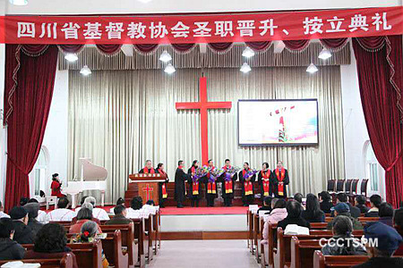 四川省基督教两会自换届以来坚持每年举行一次圣职晋升或按立典礼。其程序非常严谨、步骤合理,真正把信仰虔诚、专心侍主、忠心又有见识的同工晋升或按立出来。工作中做到了上半年同工们有再立新志使命的,通过祷告后写出书面申请与侍奉总结,提交给所在教会,由所在教会组织会议述职、民主测评与教会推荐,再呈报四川省基督教两会圣职事工委员会会议研究讨论,填报认定备案表,会议审核,诫勉谈话,所在教会公示,认定备案,省基督教两会到所在教会召开座谈会与当地主管部门交换意见,下半年适时举行圣职晋升与按立典礼活动。今年上半年省基督教“两会”收到15位同工的申请,在其过程中只有9位同工符合晋升或按立要求接受了圣职。