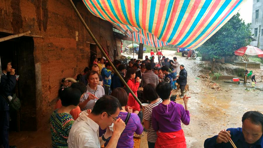 中午到了用餐时间,外面还在下着雨,虽然在房子外面搭了一点雨棚,也是无济于事,用彩条布搭的雨棚大部分都有漏,可以说是在雨中用餐,大家仍然是其乐融融,吃的有滋有味,这正应验了圣经说的,在神家里吃饭的人有福了。