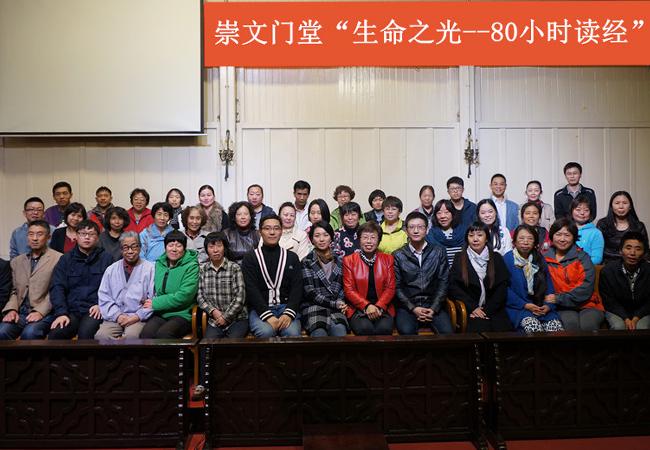 崇文门教会于10月10日举办了“生命之光——80小时读经”活动,从《创世记》到《启示录》,教会信徒经过80小时不间断地诵读,将《圣经》从头至尾诵读了一遍。前后共有180人参与了领读,300人进行了跟读。崇文门网站登出的文章称,有些信徒持续读经80小时,有些信徒为此次事工昼夜祷告;由于此次读经活动安排在工作日,很多年轻的信徒纷纷要求在夜间参加诵读。凌晨的诵读时间,有近20人诵读、聆听。