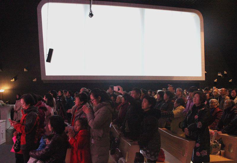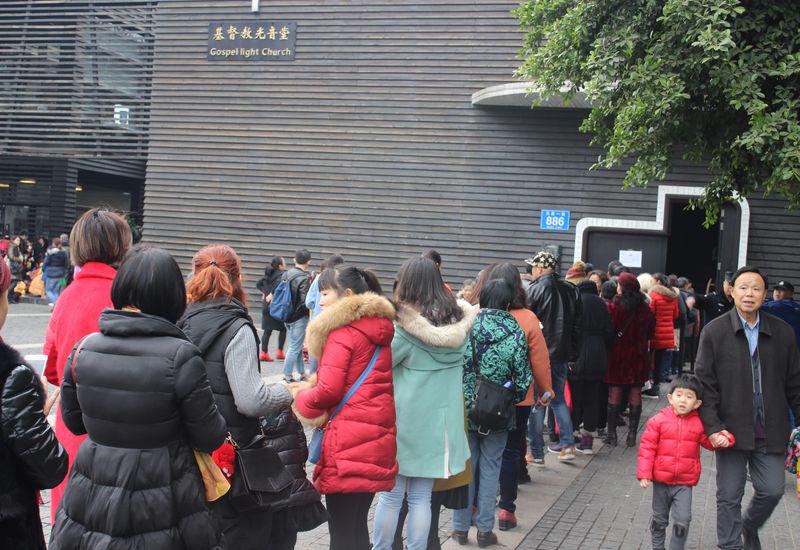 圣诞来临,12月25日当天下午一点半左右,位于成都市高新区天府社区的光音堂前排起了长队,从教堂门口一直延伸到天府一街剑南大道口,到了路边又绕回来形成一个弧形,一直到两点左右开始入场。