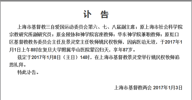 据上海基督教1月3日发布的讣告显示,姚牧师追思礼拜将于2017年1月8日(主日)14时,在上海市基督教景灵堂举行。
