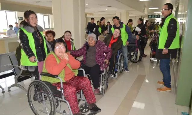 七点多,芦苇之家志愿者王家红就开车出门接参加体检的残疾人,她的老公也承担了接送任务分头接送。为了提供良好的体检环境,早在元旦前,义工汤云等就到医院联系对接,布置场地,悬挂红灯笼和气球等。