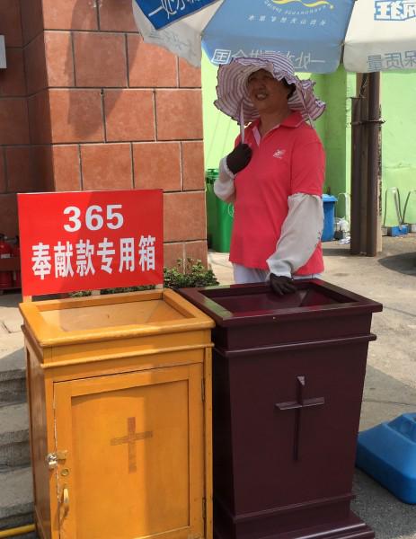 沈阳东关教会在院子里同时摆放两个奉献箱,一个是普通的奉献箱,一个是“365奉献款专用箱”。福音时报同工发现,许多信徒将奉献款投入“365奉献款专用箱”,有的是零钱,有的是上百元。