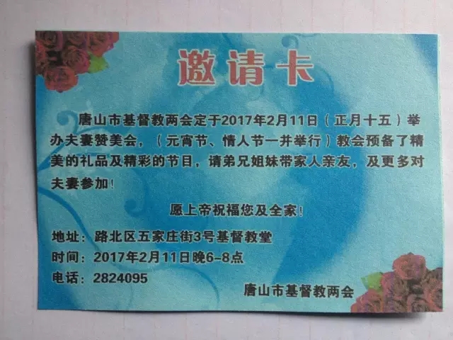 唐山市基督教两会发布的邀请卡,活动定于当天晚上6点到8点在唐山路北区五家庄街3号基督教堂举行,除了精彩的节目,教会还为大家预备了精美的礼品,邀请弟兄姐妹带家人亲友前往参加,也希望更多对夫妻能参与进来。