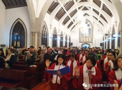 在敬拜和祷告环节,诗班、赞美队以及会众演唱了《耶稣,万名之上的名》《祷告良辰歌》《你的爱不离不弃》《复兴》等赞美诗。