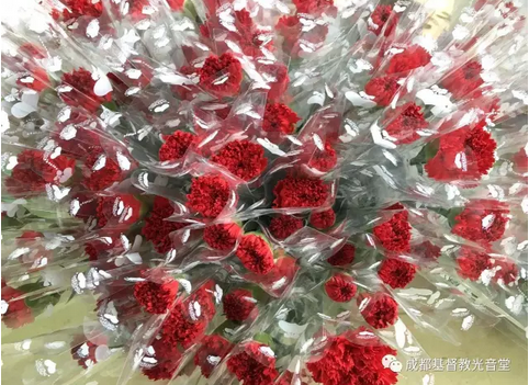 同时,光音堂主日学的孩子和福音大使组的弟兄姊妹将教会预备的康乃馨送到了出席崇拜的486位母亲手中。拿着教会预备并精心包装的康乃馨,每位母亲喜乐满怀,场面甚是温馨感人。