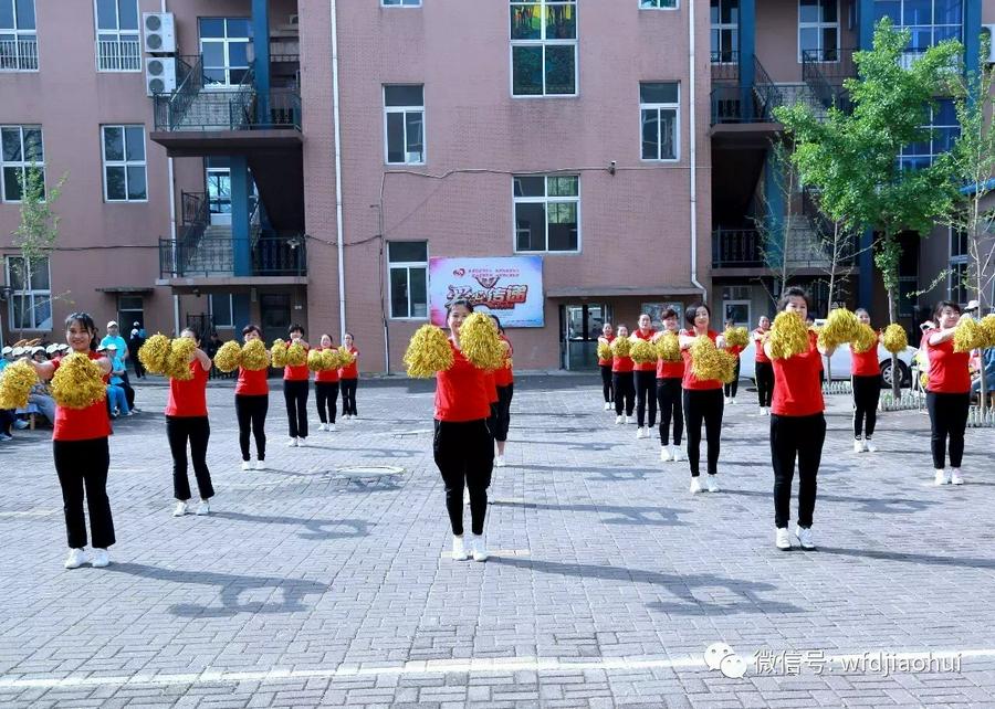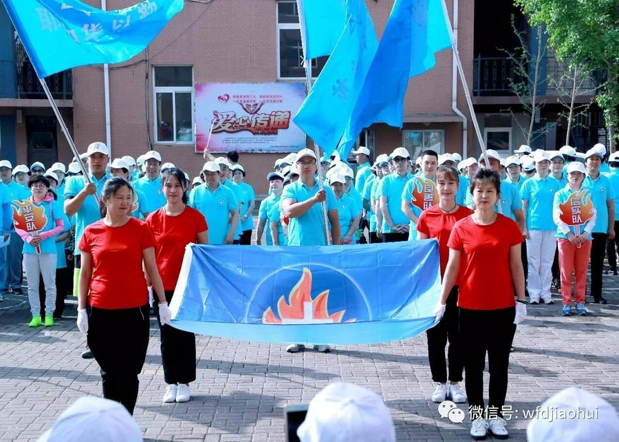 上午8:00,主持人宣布开幕式正式开始。首先,总裁判郑牧师带领裁判团入场,在主席台就座。紧接着,各个运动员代表队开始接受检阅。在庄重有力的《运动员进行曲》中,走在最前面的是四位旗手,高举瓦房店教会的会旗,紧随其后的是四面蓝色的大旗,跟着的是充满活力的拉拉队。各代表队迈着整齐划一的步伐,高喊着口号,依次走过主席台。所有代表队检阅结束后,郑牧师致开幕词,运动员和裁判员代表宣誓。全体运动员退场后,由24名身穿红色上衣、手拿金色环球的姊妹在欢快的音乐中跳起了活力四射的啦啦操。姊妹们热情洋溢的舞蹈,赢得了大家热烈的掌声。