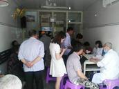 12:30分,医疗队到达村广场,许多村民早早已在等待,我们便各就各位,分工配合开展起来。众人听说名老医师梁老前来坐诊,一下围得水泄不通,幸好小滨在旁协助疏理,现场井然有序的进行着;针灸科只有梁世福医生一人负责,患者接踵而至,当地教会的一位姊妹从头到尾在充当助手,真是感恩;挂号单用完了,便用处方替代,血压一台不够,我与世乐弟兄两台并用。顶上帐篷红艳,艳阳当空,我们的心却不觉疲惫,充满火热和激情!