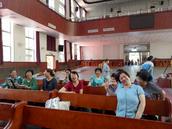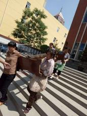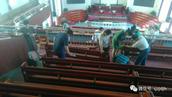 50多位弟兄姐妹齐心合力的把旧座椅搬出去,再把新座椅抬进来,许多同工主动参与安装、扛抬、摆放等工作。