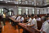 在会议室,省基督教两会副主席副会长任现民牧师介绍了在神学院建院30周年之际举办毕业生返校活动的初衷。期望透过此次返校活动,同忆校园生活,共圆教会复兴之梦。向从这里走出去的山东神学院第一届同学们介绍了济南教会换届以来的情况,认为以赵克玉主任为班子的市两会是一个很有凝聚力、战斗力、很同心的一个班子。