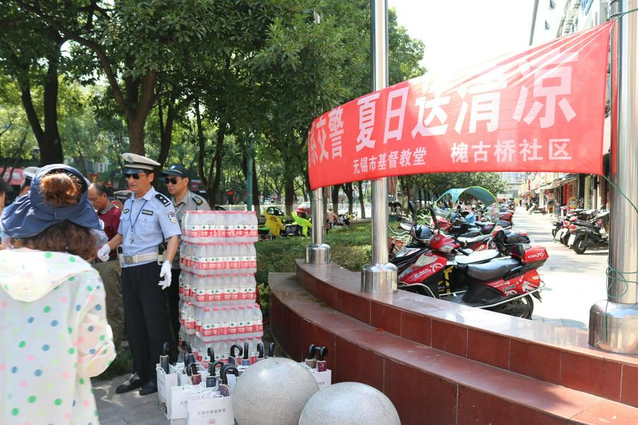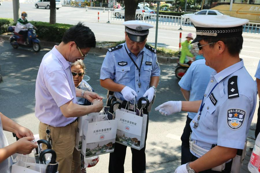 交警接过“清凉”后,露出了微笑,那一抹微笑在蓝白制服和黝黑的皮肤衬托下,显得更加可爱。有一位交警表示:谢谢无锡市基督教堂顶着烈日为我们送来夏日的清凉,谢谢教堂对我们工作的认可,今后将不辜负群众的厚望,保持饱满的精神状态和昂扬的斗志,全力以赴为全市道路交通安全管理工作做出自己最大的贡献。张牧师也表示:我堂将号召全体信徒从我做起,遵章守纪,文明出行,减少交警负担。