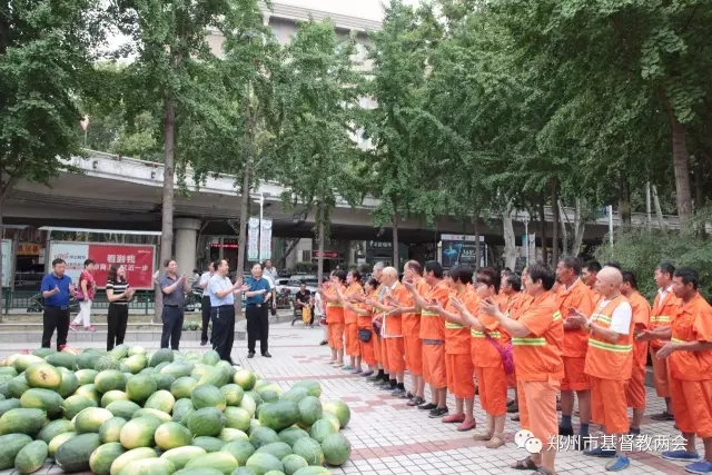 2017年7月27日下午,郑州市基督教会一行人前去探望了工作在清洁城市第一线的金水区环卫工人,并送去近万斤西瓜,在酷暑中为他们送去一丝清凉。