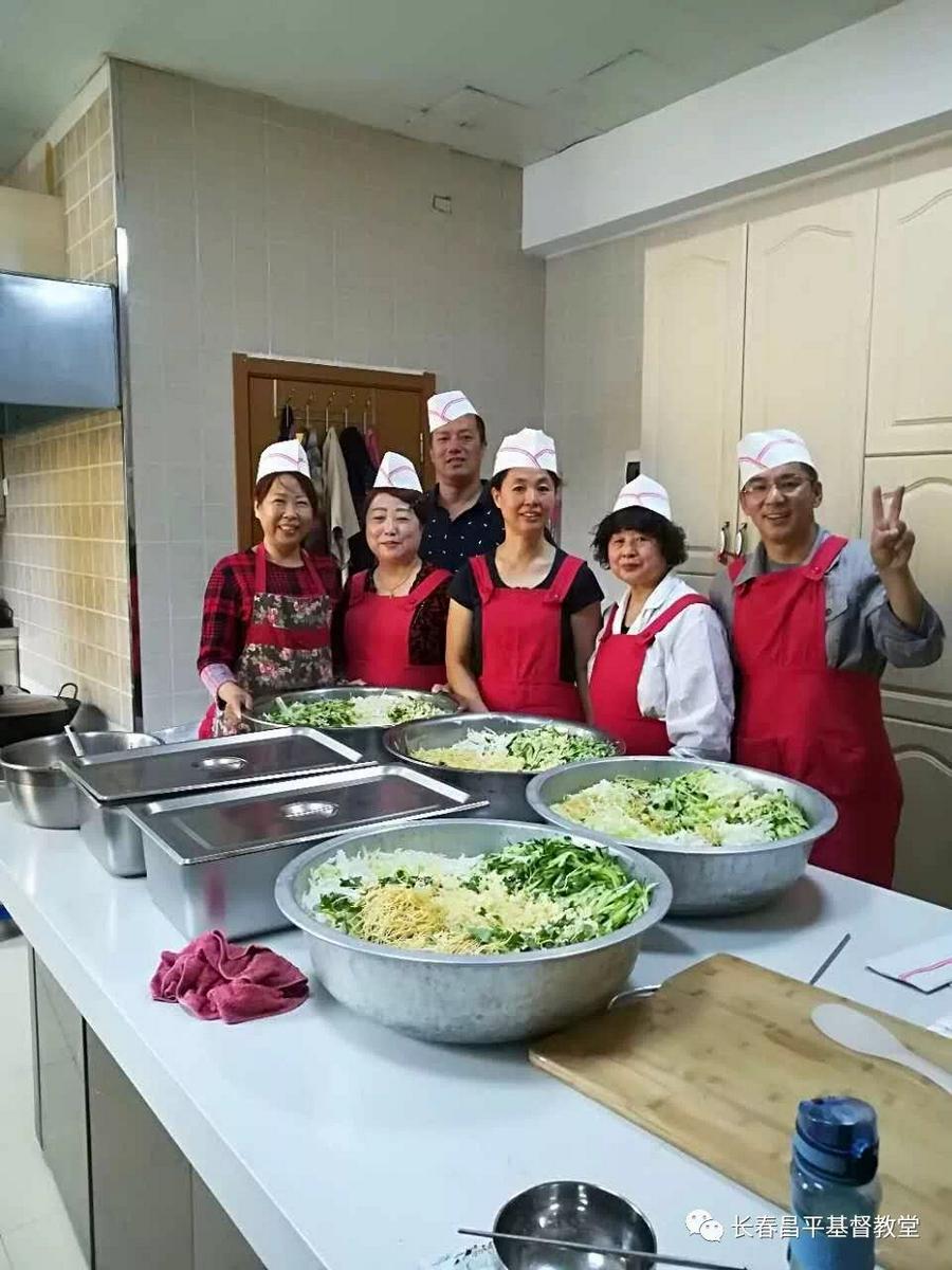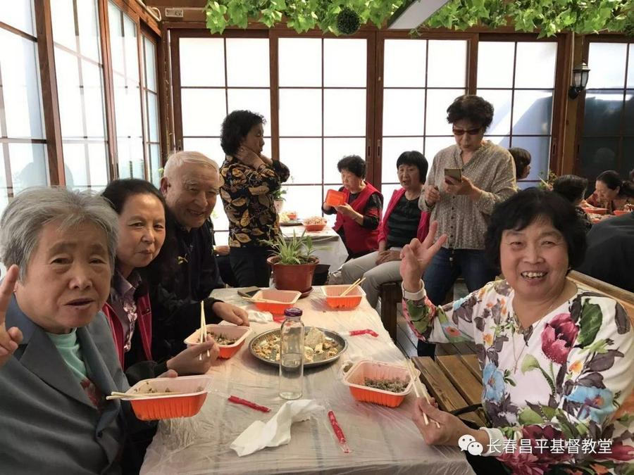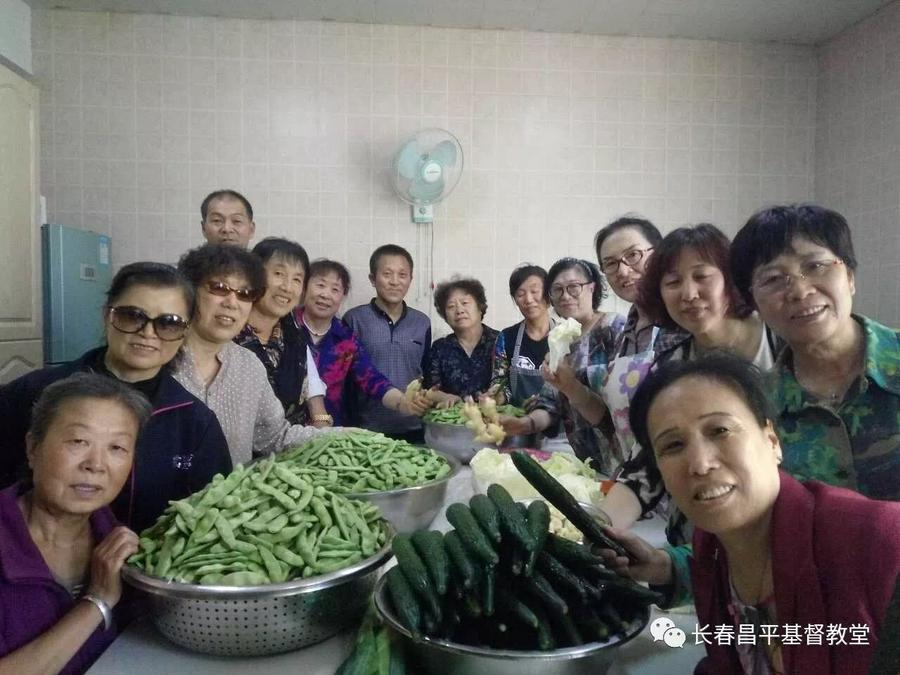昌平教会在微信上分享了会众听道、聚餐以及背后厨房服侍的场景,聚会的服侍人员由老年会的同工担任。