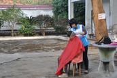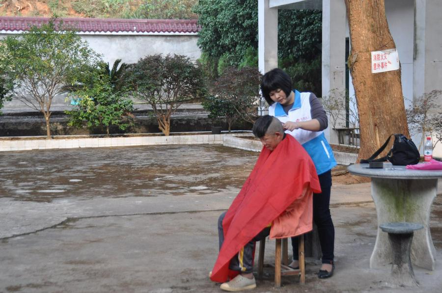 同在院子里的还有义工李巧玲,她是一位专业的理发师,她带来工具为老人们理发、刮胡子。在使用刀具时,她不小心割伤了自己的手指头,但她并没有吭声,坚持为老人理完发。