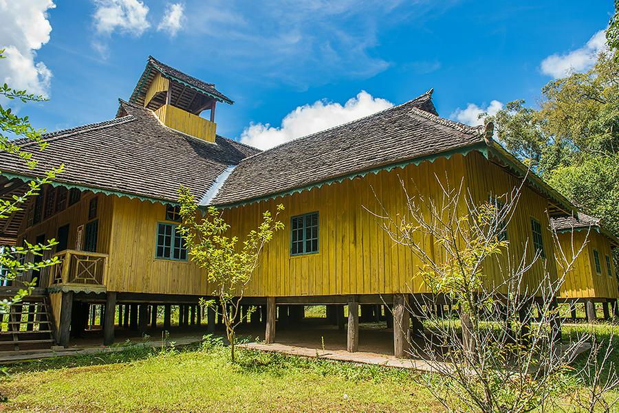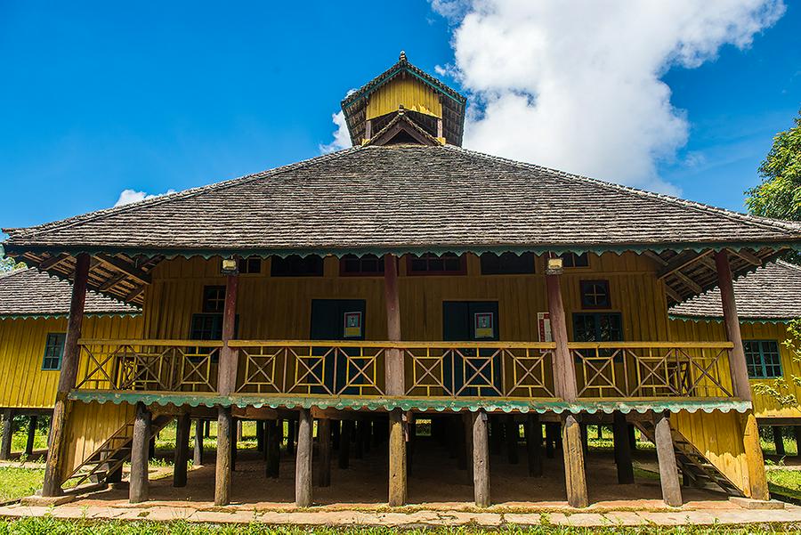 这是座拉祜族杆栏式围廊建筑,平面呈纵向双十字形。百余根一米高的梅花形脚柱支撑底部,四周为木板壁,中为礼拜堂,左右四面耳室为拉祜文教室。教堂内部装修为欧美教堂风格,有欧美式三角形窗子,半圆形门。建筑风格独特,雄伟壮观,隐匿在小山之巅的丛林之中。