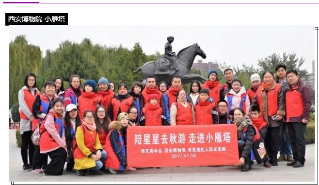 2017年11月18日下午,西安青年会志愿者服务队的20名志愿者们来到了西安莲湖区星星残疾人阳光家园(托养中心),带领12名存在不同程度智力残障的学员(小星星)一起游览西安博物院。
