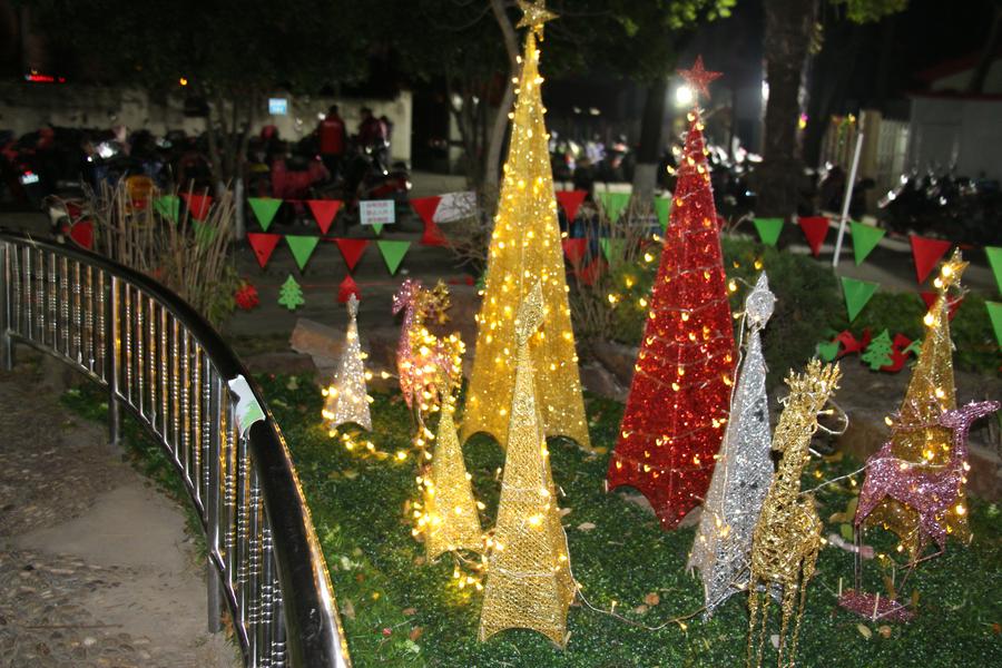 今年昆山基督堂的布置简约、朴素,有别于往年的五彩缤纷。教堂门口的小马槽及中国式五副剪纸画:“天使向马利来报喜讯”、“马利亚向以利沙伯问安”、“耶稣降生”、“天使报佳音给牧羊人”、“三博士朝拜耶稣”,以及教堂院子中央的闪光圣诞树群等,简洁明了地将圣诞的主题突出得淋漓尽致。