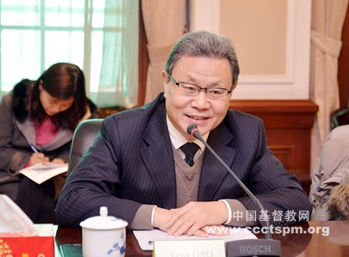 高峰牧师代表中国基督教两会和中国教会,对来宾的到访表示欢迎。高牧师指出世基联与中国基督教两会已经建立了久远和密切的关系:1948年,中国基督教界代表赵紫宸博士曾赴荷兰首都阿姆斯特丹参加世基联的成立大会,并被选为该会六大主席之一。1991年2月,丁光训主教、沈以藩主教和韩文藻博士应邀参加了世基联第七届会员大会,中国基督教协会正式成为世基联会员,回归世基联大家庭。历任总干事均来访中国,双方保持了良好的交往和互动,历任总干事与中国教会领袖也保持了良好的友谊。在总干事维特的推动和支持下,中国教会在世基联工作中发挥越来越大的作用,世基联执行委员会和中央委员会有越来越多的中国中青年同工参与进来,2012年世基联国际事务委员会和2016年世基联执行委员会会议也相继在中国召开。高牧师向来宾介绍了过去一年台湾与大陆教会之间的密切交往,以及多年前两地基督教论坛取得的卓有成效的对话成果。高牧师感谢总干事维特非常支持和尊重中国教会的三自原则和“一个中国”的原则,不愿参加台湾长老会举办的“普世论坛”活动。高牧师表示愿更多参与世基联事工,做出更大贡献;也希望世基联给予中国教会更多地理解、支持、尊重和帮助。