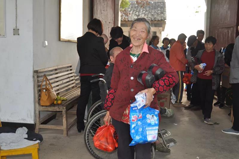 这次义工服务队给老人们带来了饼干、糖果、蛋糕、袜子、围巾。年轻的队员教老人们扎出整齐的围巾,老人们高兴地戴着围巾拍照。