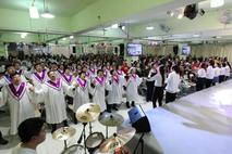 晚上6:00-8:00,是东风堂精心预备的“复活节赞美会”,由刘雪松牧师带领5位同工主领,并有玛哈念赞美队舞蹈律动。神殿内,大家高举棕树枝,口唱赞美诗,欢呼雀跃、尽情赞美,用高涨的热情与复活的主一同享受着复活的荣耀。
